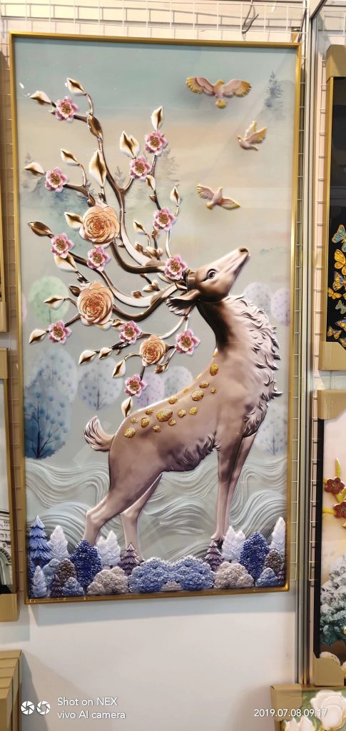 晶瓷畫是新創(chuàng)造的名稱,其工藝很新穎,表面光亮,似瓷似晶。晶瓷畫是采用優(yōu)等密度板配合優(yōu)等水晶材料,利用弘益機(jī)械設(shè)備的烤瓷機(jī),使畫和水晶材料渾然一體后,跟密度板致密結(jié)合。其實(shí)這種表面烤瓷并不高檔,應(yīng)該結(jié)合陰刻、貼箔、鑲嵌、手繪,成畫后再在表面涂層,或者稱為復(fù)一層晶瓷,這樣的畫才會(huì)顯得輕奢和高級(jí)。